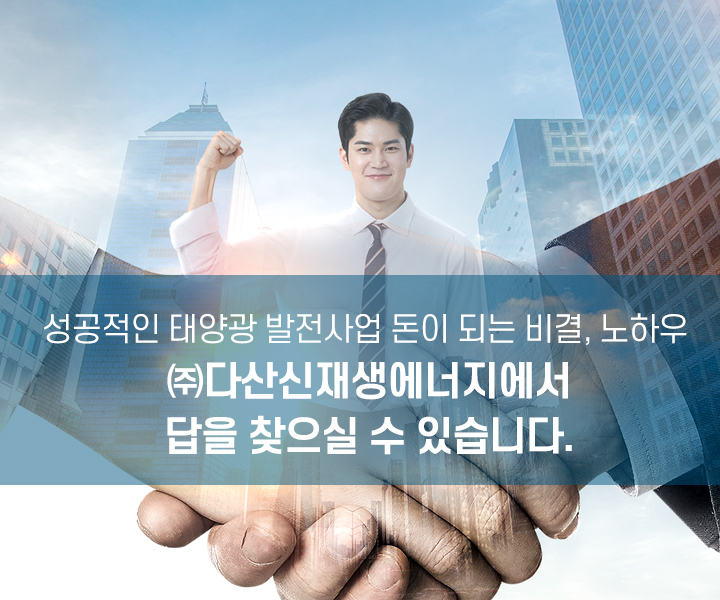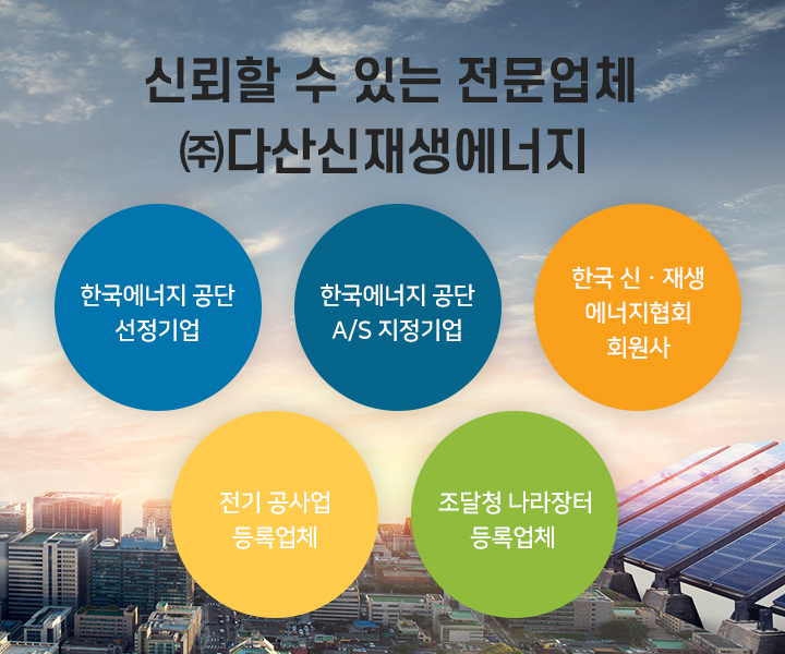 태양광발전 전문업체 (주)다산신재생에너지는 2009년 태양광 발전사업을 시작으로 10년 이상의 경험을 토대로 대한민국 태양광발전사업에 큰 업...