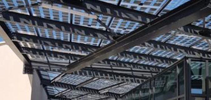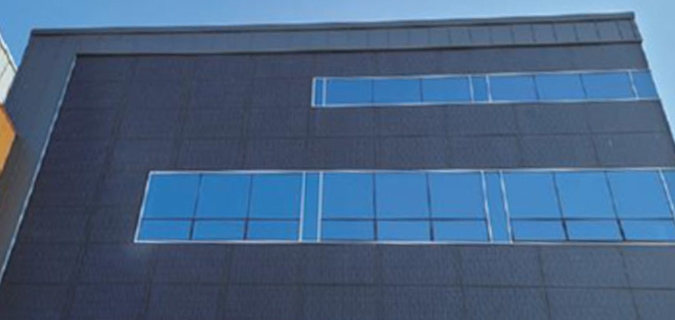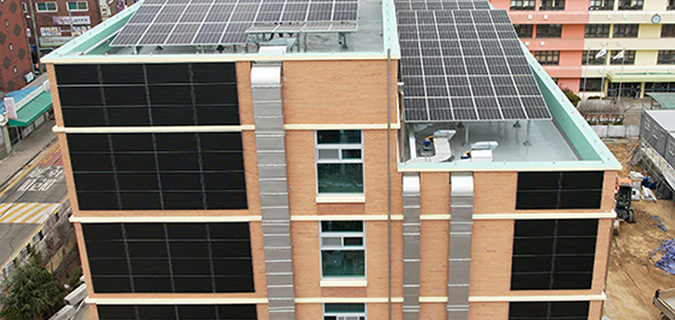 건물일체형 태양광 시스템으로 건물 외벽 건축자재 역할과전력 생산으로 태양광 발전의 기능을 동시 수행합니다.